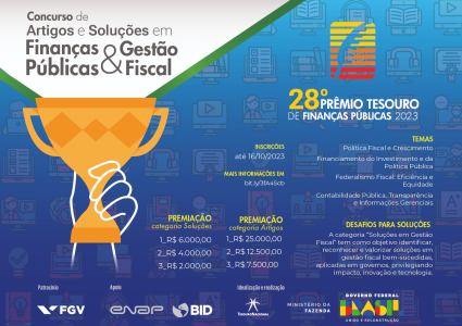 Estão abertas as inscrições para a 28° edição do Prêmio Tesouro Nacional de Finanças Públicas, que visa a estimular estudos, pesquisas e desenvolvimento de soluções na área de Finanças Públicas e Gestão Fiscal.