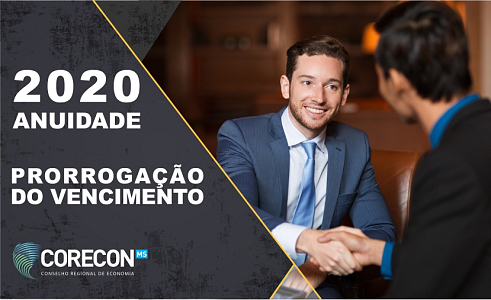 O Corecon-MS prorrogou o vencimento da Anuidade 2020 para 31 de agosto de 2020, sem cobrança de quaisquer encargos, correção monetária ou incidência de juros. A medida foi adotada com o intuito de minimizar os impactos que o Coronavírus tem provocado na rotina dos Economistas de Mato Grosso do Sul.