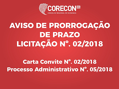 O Conselho Regional de Economia de Mato Grosso do Sul - 20ª Região, através da Comissão de Licitação, designada pela Portaria n° 05/2018 CORECON-MS, torna público aos interessados que a CARTA CONVITE Nº 02/2018 com abertura marcada para o dia 01/08/2018 às 09:00 horas, fica PRORROGADA para o dia 06 de agosto de 2018 às 08:30 horas a entrega da documentação e propostas e às 09:00 horas a abertura dos envelopes, devido alterações na documentação para habilitação descritas no item 6, subitens 6.2 e 6.4 do edital.
