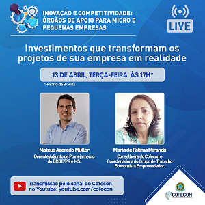 O Conselho Federal de Economia fará mais uma live do ciclo “Inovação e Competitividade: Órgãos de apoio para micro e pequenas empresas” no dia 13 de abril, terça-feira às 17h (horário de Brasília). Dessa vez, o foco está nos investimentos que possuem o potencial de transformar os projetos das empresas em realidade.