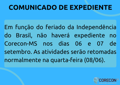 Em função do feriado da Independência do Brasil, não haverá expediente no Corecon-MS nos dias 06 e 07 de setembro. As atividades serão retomadas normalmente na quarta-feira (08/06).