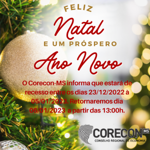 O Corecon-MS informa que estará de recesso entre os dias 23/12/2022 à 05/01/2023. Retornaremos dia 06/01/2023 a partir das 13:00h.