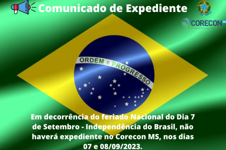 Em decorrência do feriado Nacional do Dia 7 de Setembro - Independência do Brasil, não haverá expediente no Corecon MS, nos dias 07 e 08/09/2023.
