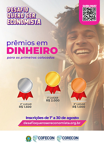 Não perca a chance de participar do Desafio Quero Ser Economista! Voltado aos estudantes de Ensino Médio, o Desafio Quero Ser Economista é uma competição que apresenta conceitos básicos da Ciência Econômica de forma divertida e descomplicada. Basta ter acesso à internet para participar do jogo. É uma competição emocionante que explora conceitos econômicos de maneira divertida e descomplicada. E o melhor de tudo? Os três primeiros colocados levam prêmios em dinheiro!