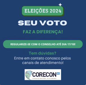 O Conselho Regional de Economia de Mato Grosso do Sul (Corecon-MS) anuncia que, entre os dias 29 e 31 de outubro de 2024, ocorrerão as eleições para a renovação de um terço do CORECON-MS.