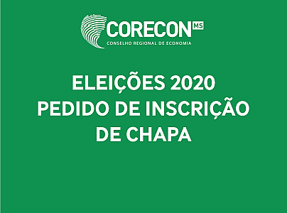 A Comissão Eleitoral do Conselho Regional de Economia 20ª Região/MS – CORECON-MS torna público que recebeu a solicitação de inscrição de uma chapa para as Eleições 2020 do CORECON MS, compostas pelos membros abaixo.