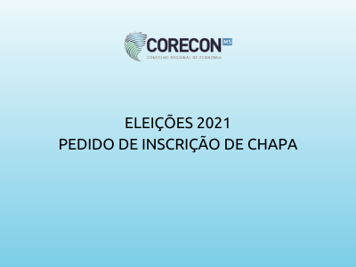 A Comissão Eleitoral do Conselho Regional de Economia 20ª Região/MS – CORECON-MS torna público que recebeu a solicitação de inscrição de uma chapa para as Eleições 2021 do CORECON MS, compostas pelos membros abaixo.