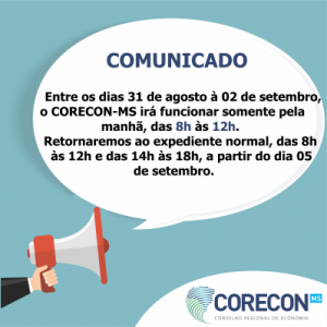 Entre os dias 31 de agosto à 02 de setembro, o CORECON-MS irá funcionar somente pelo período da manhã, das 8h às 12h. Retornaremos ao expediente normal, das 8h às 12h e das 14h às 18h, a partir do dia 05 de setembro.