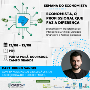 De 12 a 15 de agosto, o CORECON-MS promove a Semana do Economista com o tema "Economista, o profissional que faz a diferença". Um evento voltado para estudantes, profissionais e todos os interessados nos desafios e oportunidades da economia contemporânea.