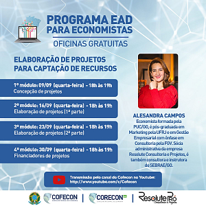 No mês de setembro, o Cofecon oferecerá mais uma oficina gratuita por meio da plataforma de Educação a Distância. A economista Alesandra Campos apresentará o tema “Elaboração de projetos para captação de recursos” em quatro encontros, com início na próxima quarta-feira, dia 09.