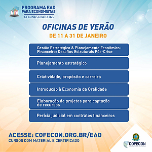De 11 a 31 de janeiro, as oficinas gratuitas realizadas ao longo de 2020 estarão disponíveis na plataforma EAD do Cofecon. Para participar basta acessar o site www.cofecon.org.br/ead, realizar a inscrição, assistir aos vídeos e baixar o material. Após a conclusão de cada curso, os alunos receberão certificado.