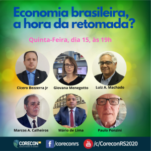 Os economistas CÍCERO BEZERRA JÚNIOR (Conselheiro Cofecon), GIOVANA MENEGOTTO (Sistema Fecomércio/RS, conselheira Corecon-RS), LUIZ ALBERTO MACHADO (Sócio-Diretor SAM Consultoria, ex-presidente Corecon-SP), MARCOS ANTÔNIO MOREIRA CALHEIROS (Membro CDE-AL, presidente Corecon-AL/Sindecon-AL) e PAULO SALVATORE PONZINI (Presidente Corecon-MS) participaram da live, realizada na última quinta-feira, dia 15 de abril, com o tema “Economia brasileira, a hora da retomada?”. O economista MÁRIO DE LIMA (Professor, Assessor SFMPA, presidente do Corecon-RS) foi o moderador da live.