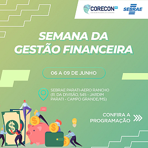Vem aí a Semana da Gestão Financeira Sebrae/Corecon-MS. De 06 a 09 de junho, teremos palestras gratuitas sobre crédito, renegociação de dívidas, organização de finanças e um Dia do Crédito com atendimento de bancos convidados para te orientar a conseguir aquele financiamento que vai impulsionar seu negócio.