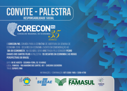 O Conselho Regional de Economia de Mato Grosso do Sul, convida para cerimônia de abertura da SEMANA DE ECONOMIA 2016 - Desafios da economia, evento em comemoração ao "Dia do Economista". Na ocasião, será ministrada pelo Senador Pedro Chaves dos Santos Filho a Palestra "Os desafios da Economia e as novas perspectivas do Brasil".