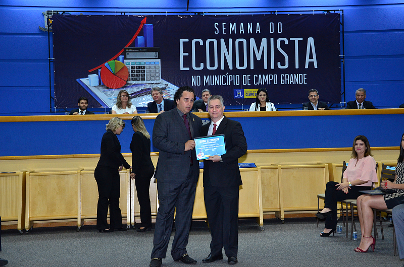 Os vereadores da Câmara Municipal de Campo Grande realizaram, na quarta-feira (09/08/2017), Sessão Solene em alusão a Semana do Economista. A Semana foi instituída na Capital por meio da lei n. 4.654/08, de autoria dos vereadores Cristóvão Silveira e Jorge Martins. Na ocasião, foram homenageados economistas que prestaram relevantes serviços à comunidade campo-grandense. Foi prestado também pelo Corecon uma homenagem a Cristóvão Silveira em forma de agradecimento ao empenho dedicado em 2008, como vereador, em conduzir o processo de aprovação da lei que constituiu a Semana do Economista na Capital.