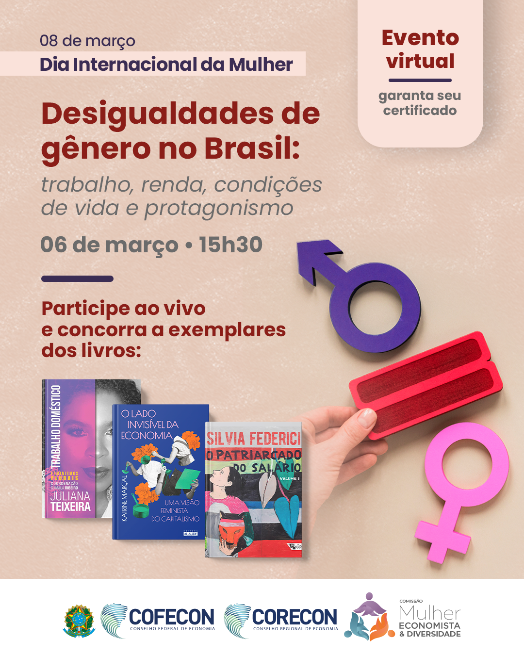 O Conselho Federal de Economia, por meio da Comissão Mulher Economista e Diversidade, realiza no dia 6 de março (sexta-feira), às 15:30 horas, um debate comemorativo ao Dia Internacional da Mulher. O tema será “Desigualdades de gênero no mercado de trabalho: oportunidades, riscos, liderança e ação coletiva” e haverá transmissão pelo canal do Cofecon no YouTube. As inscrições podem ser feitas clicando AQUI (https://www.even3.com.br/desigualdades-de-genero-no-brasil-695767/), com emissão de certificados com horas complementares para os participantes.