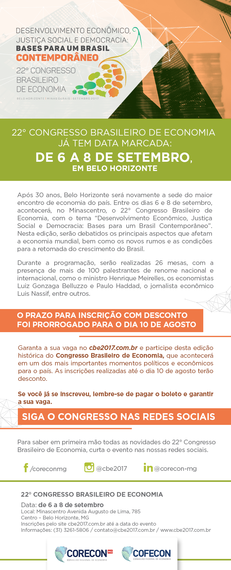 Após 30 anos, Belo Horizonte será novamente a sede do maior encontro de economia do país. Entre os dias 6 e 8 de setembro, acontecerá, no Minascentro, o 22º Congresso Brasileiro de Economia, com o tema "Desenvolvimento Econômico, Justiça Social e Democracia: Bases para um Brasil COntemporâneo". Nesta edição, serão debatidos os principais aspectos que afetam a economia mundial, bem como os novos rumos e as condições para a retomada do crescimento do Brasil.