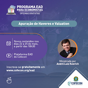 A Escola de Educação a Distância para Economistas do Cofecon oferece a partir da próxima segunda-feira (22) a oficina Introdução a Apuração de Haveres e Valuation, ministrada pelo economista André Koerich. Ao todo serão quatro aulas, nos dias 22, 23 e 24 de maio (gravadas), e 25 de maio (ao vivo), 18h30, com possibilidade de interação, em tempo real, com o professor.
