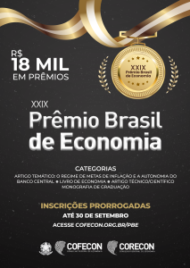 Estão abertas as inscrições para a 29ª edição do Prêmio Brasil de Economia (PBE), a principal premiação voltada para profissionais e estudantes das Ciências Econômicas. Os interessados podem se inscrever a partir de hoje, 3 de abril, até o dia 31 de agosto de 2023, em quatro categorias: Livro de Economia, Artigo Técnico/Científico, Monografia de Graduação e Artigo Temático: O regime de metas de inflação e a autonomia do Banco Central. A premiação total será de R$18 mil.