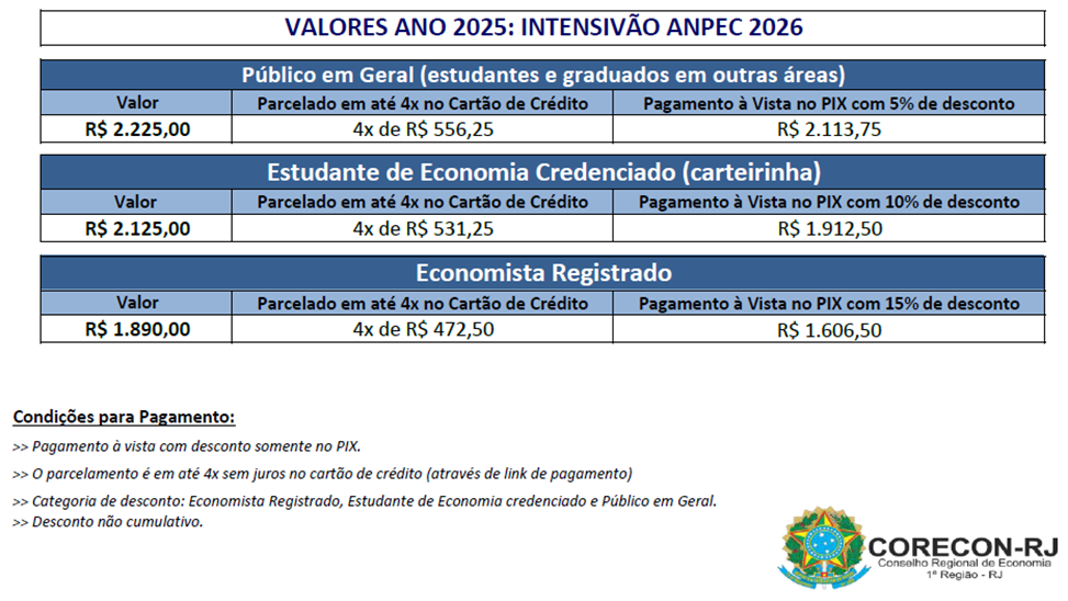 - Os estudantes de economia e os economistas registrados deverão comprovar sua condição, para aplicação dos valores informados: estudantes de economia devem portar a carteirinha e o economista registrado deve estar com a sua anuidade em dia.