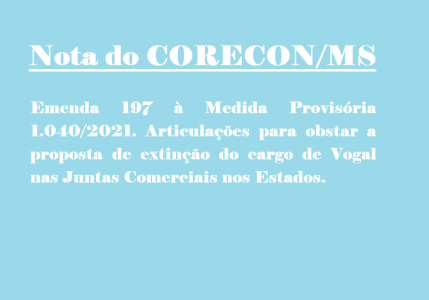 O CORECON-MS, tomou conhecimento da proposta de extinção do cargo de Vogal nas Juntas Comerciais e encaminhou ofício 013/2021 aos Deputados Federais de MS, solicitando que atuem para a rejeição da Emenda 197. A Medida Provisória 1.040 encontra-se atualmente em trâmite na Câmara dos Deputados.