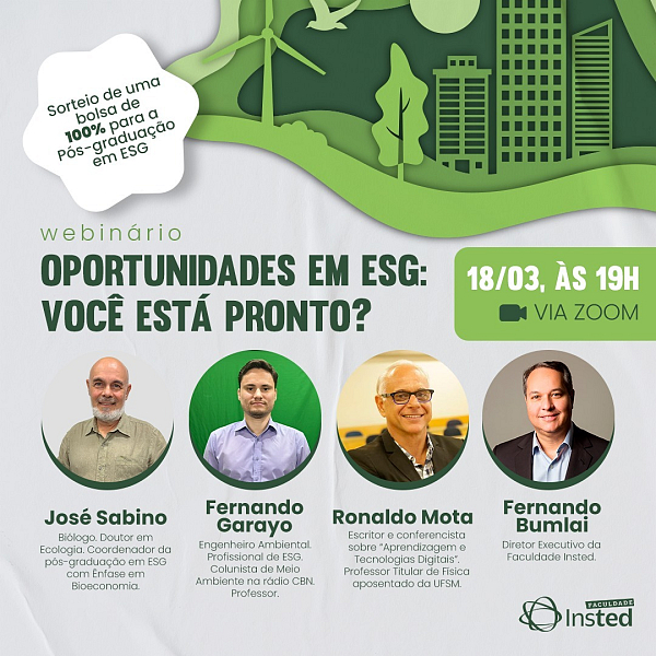Descubra como o ESG pode contribuir para sua carreira! Inscreva-se para o Webinário Oportunidades em ESG: você está pronto? e concorra a uma bolsa de 100% para a pós-graduação em ESG com ênfase em Bioeconomia. ????