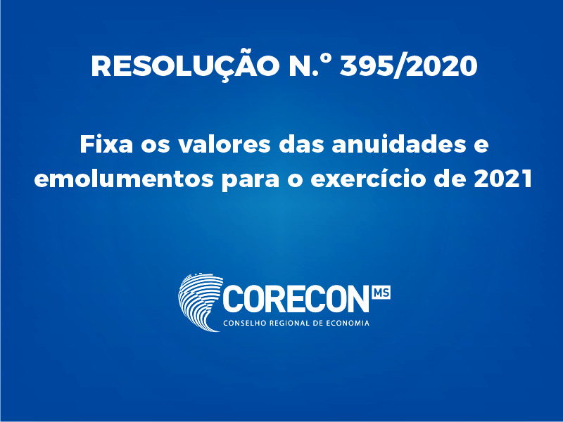 O CONSELHO REGIONAL DE ECONOMIA DA 20ª REGIÃO - MS, usando de suas atribuições legais e regulamentares, constantes da Lei nº. 1.411, de 13 de agosto de 1951, regulamentada pelo Decreto nº 31.794, de 17 de novembro de 1952, da Lei nº 6.021, de 03 de janeiro de 1974, da Lei nº. 6.537, de 19 de junho de 1978, da Lei n.º 12.514, de 28 de outubro de 2011, da Resolução Cofecon nº. 2.055/2020, de 28 de setembro de 2020, tendo em vista as deliberações da 134ª Sessão Plenária Extraordinária do Corecon-MS, realizada em 16 de novembro de 2020, e;