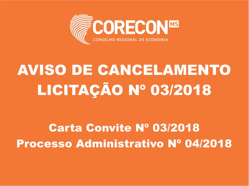 O Conselho Regional de Economia de Mato Grosso do Sul - 20ª Região, através da Comissão de Licitação, designada pela Portaria n° 05/2018 CORECON-MS, torna público aos interessados que a CARTA CONVITE Nº 03/2018, instalação e aquisição de Ar Condicionado foi cancelada pela necessidade de realizar a modalidade de Pregão Presencial, conforme Decreto 5.450 de 31/05/2005, Art. 4. Em breve será divulgado o novo Edital.