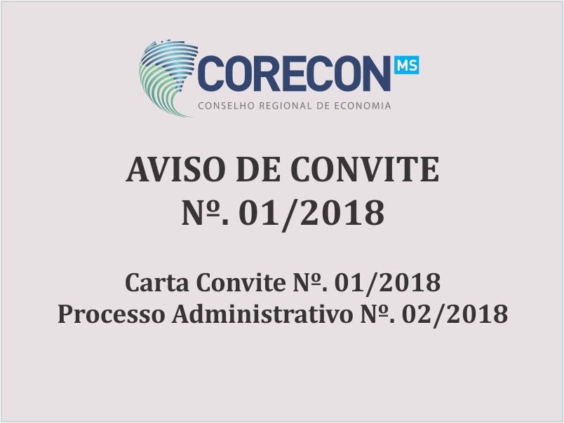 O Conselho Regional de Economia de Mato Grosso do Sul - 20ª Região, através da Comissão de Licitação, designada pela Portaria n° 05/2018 CORECON-MS, torna público aos interessados a realização de licitação na modalidade CONVITE, do tipo MENOR PREÇO, nos termos da legislação pertinente.