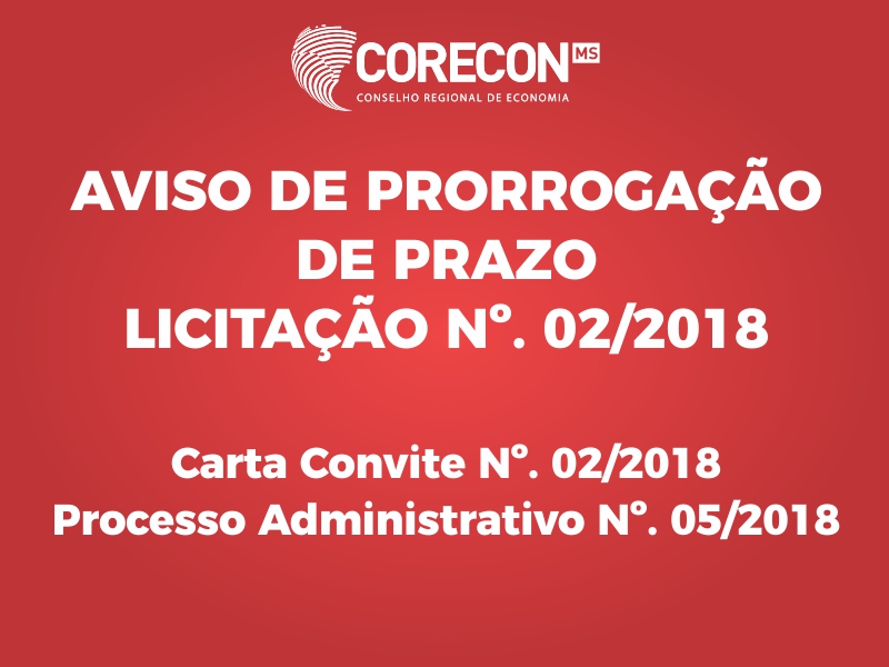O Conselho Regional de Economia de Mato Grosso do Sul - 20ª Região, através da Comissão de Licitação, designada pela Portaria n° 05/2018 CORECON-MS, torna público aos interessados que a CARTA CONVITE Nº 02/2018 com abertura marcada para o dia 01/08/2018 às 09:00 horas, fica PRORROGADA para o dia 06 de agosto de 2018 às 08:30 horas a entrega da documentação e propostas e às 09:00 horas a abertura dos envelopes, devido alterações na documentação para habilitação descritas no item 6, subitens 6.2 e 6.4 do edital.