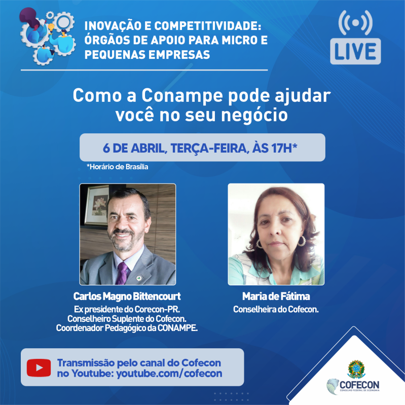 O primeiro encontro acontecerá no dia 6 de abril e o convidado será o economista Carlos Magno Andrioli Bittencourt. Ele é coordenador pedagógico da Confederação Nacional das Micro e Pequenas Empresas e Empreendedores Individuais (Conampe) e falará sobre como esta instituição pode ajudar você no seu negócio. Bittencourt também é ex-presidente do Corecon-PR e conselheiro federal suplente. A live pode ser acompanhada clicando AQUI.
