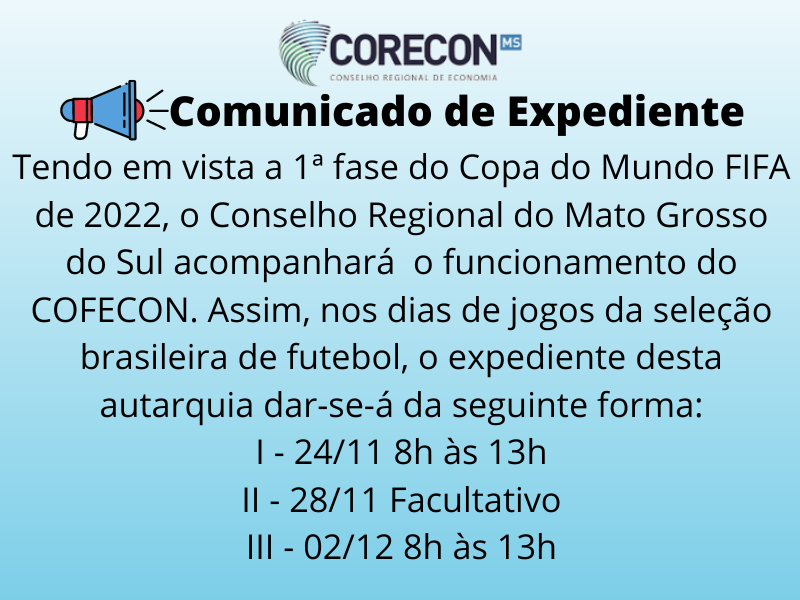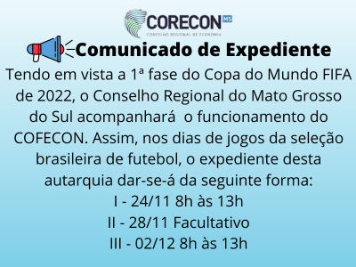 Tendo em vista a 1ª fase do Copa do Mundo FIFA de 2022, o Conselho Regional do Mato Grosso do Sul acompanhará o funcionamento do COFECON. Assim, nos dias de jogos da seleção brasileira de futebol, o expediente desta autarquia dar-se-á da seguinte forma: