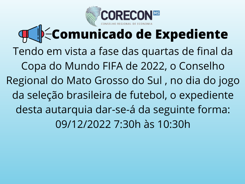 Tendo em vista a fase das quartas de final da Copa do Mundo FIFA de 2022, o Conselho Regional do Mato Grosso do Sul, no dia do jogo da seleção brasileira de futebol, o expediente desta autarquia dar-se-á da seguinte forma: 09/12/2022 7:30h às 10:30h