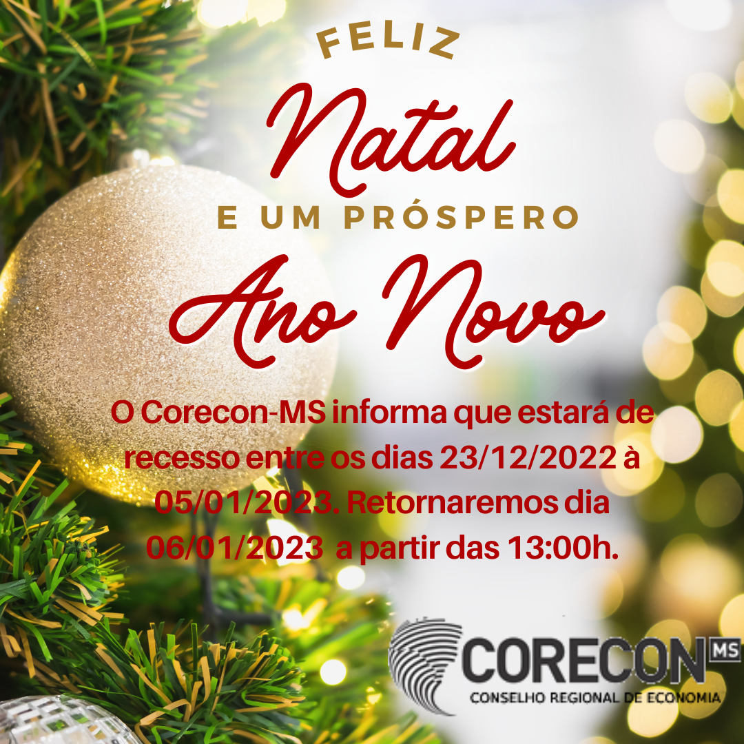 O Corecon-MS informa que estará de recesso entre os dias 23/12/2022 à 05/01/2023. Retornaremos dia 06/01/2023 a partir das 13:00h.