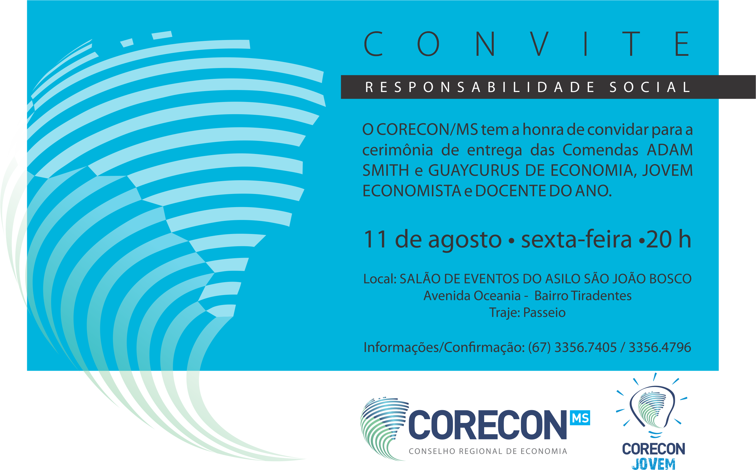 O evento será realizado a partir das 20 horas no salão de eventos do Asilo São João Bosco, em Campo Grande, instituição que foi apadrinhada pelo CORECON há dois anos. A parceria permitiu sustentabilidade financeira à entidade, proporcionando mais autonomia e independência econômica à instituição. “Acreditamos que o papel do Conselho é valorizar a profissão e promover o desenvolvimento econômico também. Mas é preciso ampliar a ação da sociedade organizada e levar o trabalho para as instituições que realmente fazem a diferença para a sociedade. É a parte da responsabilidade social que toda organização, privada ou pública, deve abraçar”, afirma Thales. “Uma sociedade mais justa e igualitária precisa de ações firmes”.
