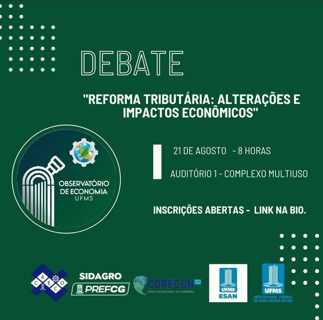 O Observatório de Economia da Fundação Universidade Federal do Mato Grosso do Sul - OBECON/UFMS, em parceria com o Conselho Regional de Economia (CORECON/MS), e com a Secretaria Municipal de Inovação, Desenvolvimento Econômico e Agronegócio de Campo Grande (SIDAGRO) tem o enorme prazer de convidá-lo para prestigiar um debate sobre "Reforma tributária: alterações e impactos econômicos".