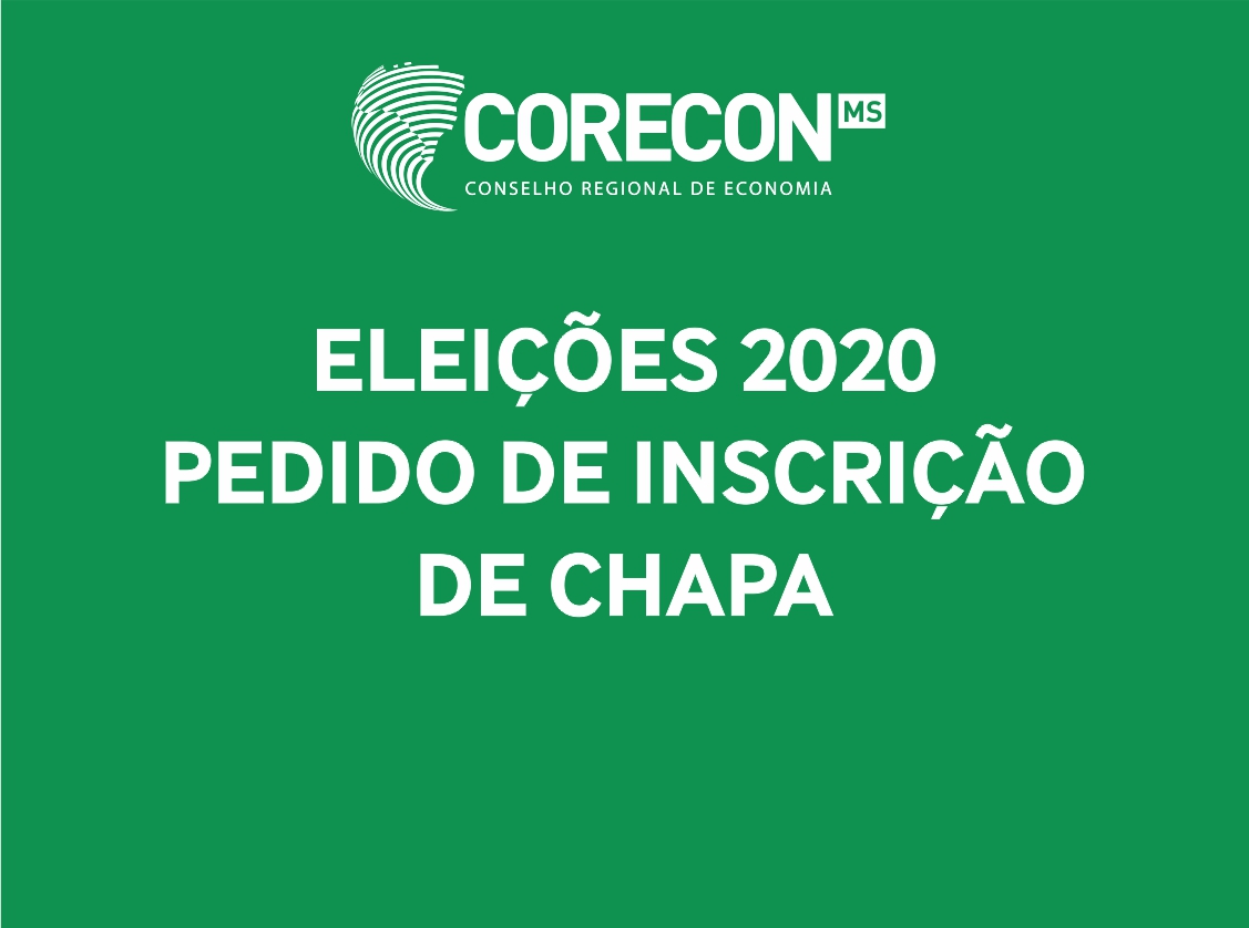 A Comissão Eleitoral do Conselho Regional de Economia 20ª Região/MS – CORECON-MS torna público que recebeu a solicitação de inscrição de uma chapa para as Eleições 2020 do CORECON MS, compostas pelos membros abaixo.