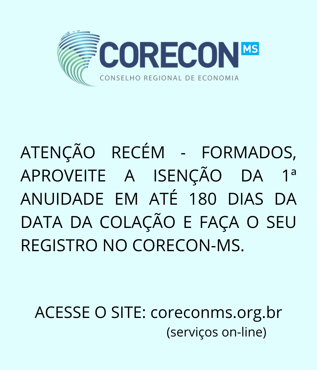 Atenção Recém - FORMADOS, aproveite a isenção da 1ª ANUIDADE em até 180 dias da colação e faça o seu registro no CORECON-MS.
