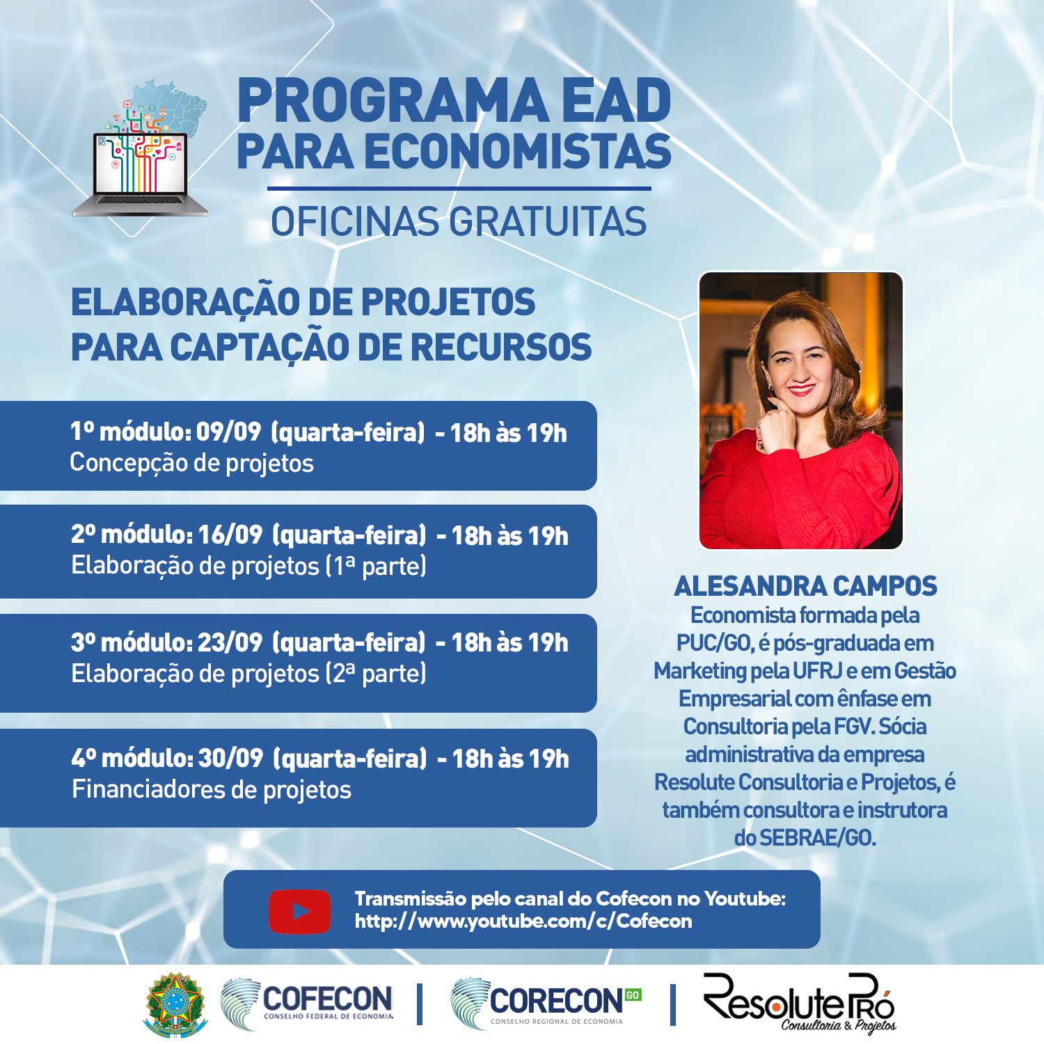 No mês de setembro, o Cofecon oferecerá mais uma oficina gratuita por meio da plataforma de Educação a Distância. A economista Alesandra Campos apresentará o tema “Elaboração de projetos para captação de recursos” em quatro encontros, com início na próxima quarta-feira, dia 09.