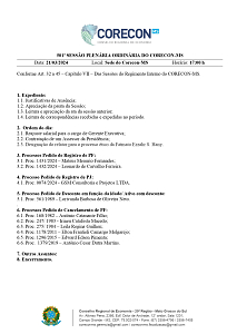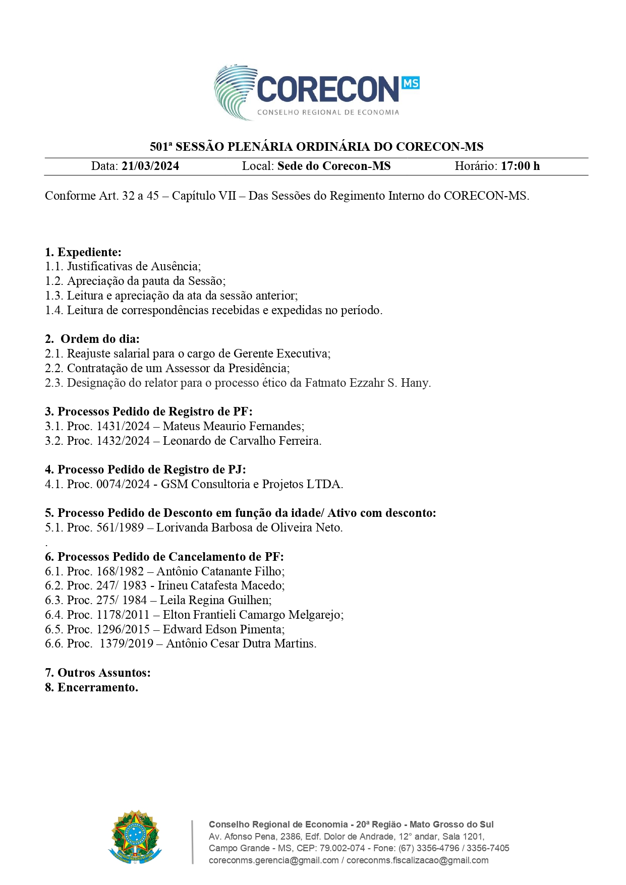 Pauta da 501ª Sessão Plenária Ordinária Do Corecon-MS.