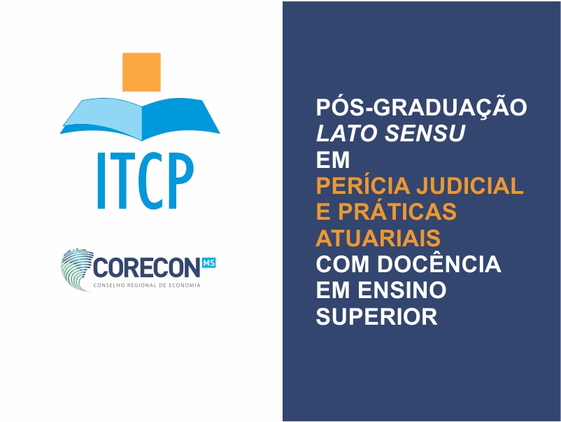 O ITCP (Instituto Tecnológico de Ciência e Pesquisa) irá oferecer a Pós-Graduação em Perícia Judicial e Práticas Atuariais com docência em Ensino Superior, com início das aula em 16/03/2019. Em convênio celebrado entre o CORECON-MS e o ITCP, os Economistas registrados e adimplentes terão desconto de 20% no valor da mensalidade. As inscrições poderão ser realizadas no link a seguir: http://www.itcp.com.br/curso.cfm?cod=1379. Maiores informações no banner informativo abaixo e no link da inscrição. Não perca essa oportunidade! Vagas limitadas...